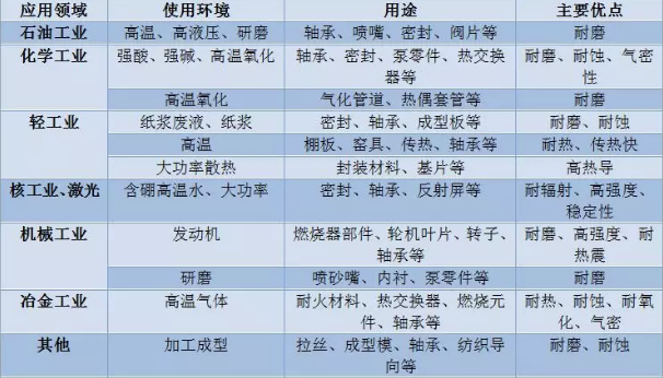 碳化硅以共價鍵為主,共價鍵約占88%。晶格的基本結構是互相穿插的SiC4和CSi4四面體。SiC具有α和β2種晶型,當溫度低于1600℃時,SiC以β-SiC形式存在,當高于1600℃時,β-SiC轉變為α-SiC形式。碳化硅陶瓷在現代的工業中碳化硅起著不可或缺的作用。表1詳細地列出了其用途。